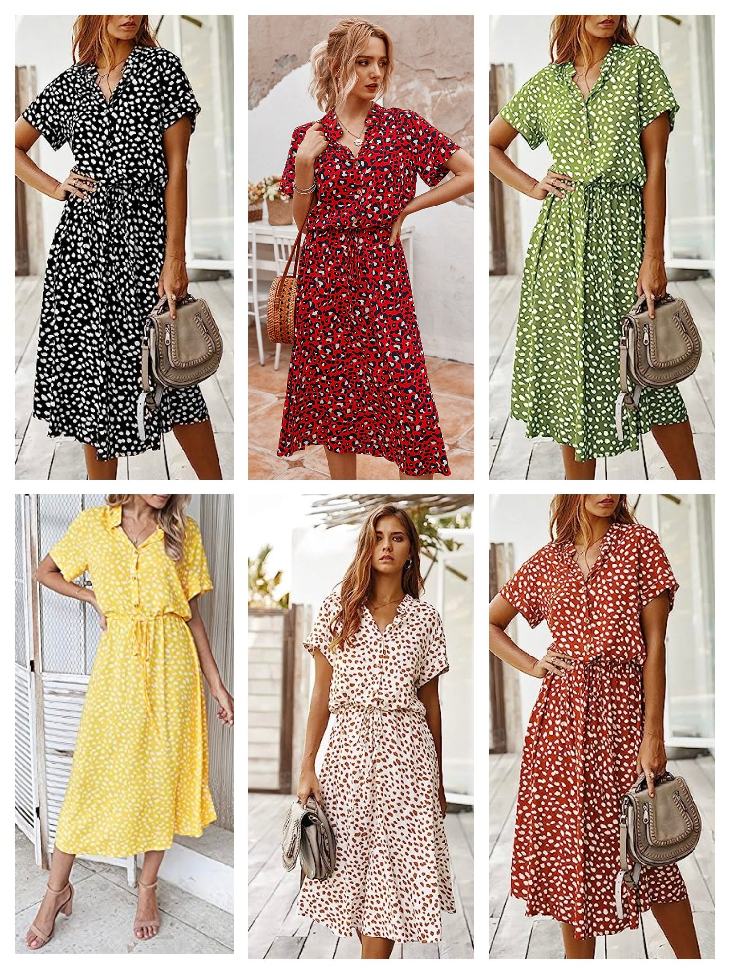 - [STYLISH DESIGN]-Summer midi dress for women design with classic button down henley closure to show your charming neckline,casual rolled short sleeve,adjustable tie front waist is more custom fit upon your need,gorgeous high waist line will visually prolong your length,elegant midi length,vintage polka dot print,relaxed a line swing flowy design,eyes catching bohemian style make this dress be your must-have in summer fashion.