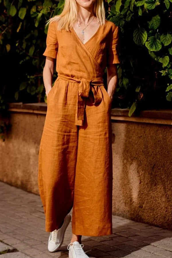SHORT SLEEVE SOLID COLOR LACE-UP V NECK SOFT ROMPER JUMPSUIT