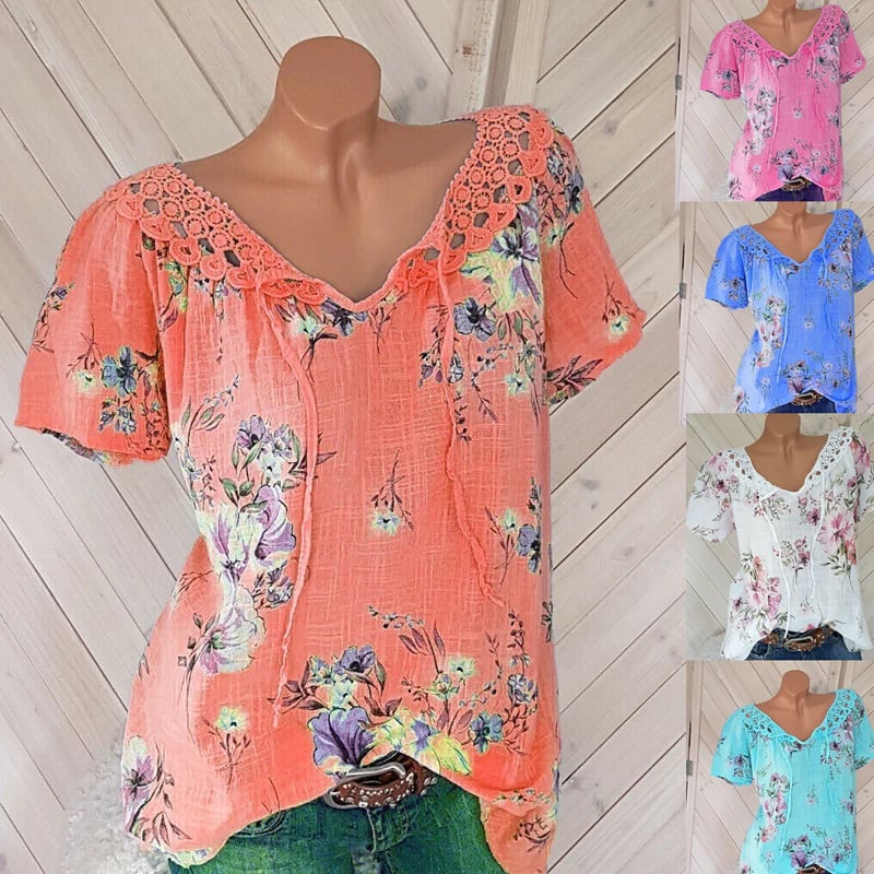 - This printed t-shirt with V-neck lace is a very flattering loose fit for everyday use and it looks stylish, feminine and polished.